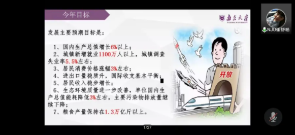 随后,南京大学马克思主义裸聊直播 2020级中国近现代史基本问题专业的硕士研究生崔舒畅同学作《乘风破浪:中国发展未来可期——基于2021年〈政府工作报告〉》的主题报告。崔舒畅同学以生动的案例、直观的图片和流畅的语言呈现出《政府工作报告》的主要内容,引导与会同学学习《政府工作报告》的主要精神。今年两会上,李克强总理的《政府工作报告》突出了2020年的不平凡,体现了2020年中国人民为实现国家发展所作出的伟大贡献,崔舒畅同学提炼出抗击疫情、经济正增长、脱贫攻坚、聚焦问题的困难与挑战等关键词,呈现出中国共产党继往开来的伟大使命,以实打实的数据统计观察中国的发展情况,为与会同学上了一堂鲜活生动的时政课。