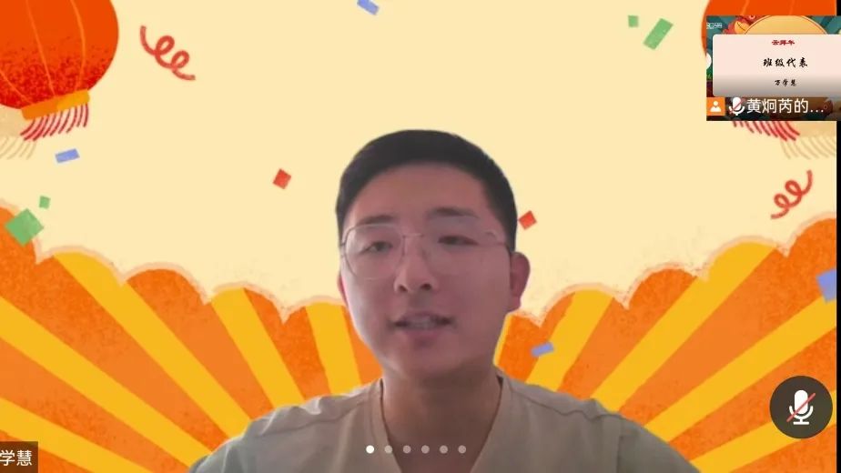 乡心新岁切,烟火慰风尘。本次联欢会特设“云拜年”环节。陕西学子吉嘉洁、孙祎达、牛昱尧以及河南学子李爽爽分别介绍了各自家乡的春节民俗,不同的风土民俗让同学们感受到中国传统节日的魅力,也驱散了浓浓乡愁。班级代表万学慧向各班留校同学送上新春祝福。邓一帆、张倩、李爽爽和林素莹同学的家长亲友们也分别从海峡两岸发来祝愿。跟中国一样,春节也是韩国的最大传统节日。韩国留学生曹大浩同学的友人也特地送上越洋祝福,向所有欢度农历新年的同学致以问候,并表达了对冬奥会的期待之情。