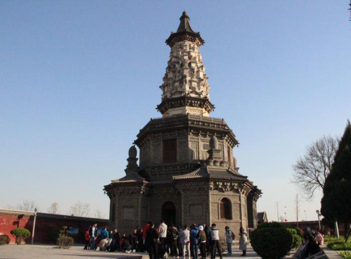 下午4点钟左右,师生又步行前往临济寺。临济寺,始建于东魏孝静帝兴和二年(540年),其为中国佛教禅宗临济一派的发祥地,也是日本佛教临济宗的祖庭。张老师为同学们介绍了该塔的特点,其为砖仿木结构密檐塔,塔身第一级基高,四面设有对开式假门,四侧面设假窗,转角做圆形倚柱,雕刻精细,独具匠心以上八级相距较近,层层出檐,塔以跳出的斗拱承托。各斗拱设计精巧,富于变化,重檐密布的塔身之上置塔刹。张永波老师补充道,由于塔身清瘦,玲珑别致,正定人爱称之为“青塔”。陈粟裕老师借助展板,为大家梳理了禅宗的发展脉络。