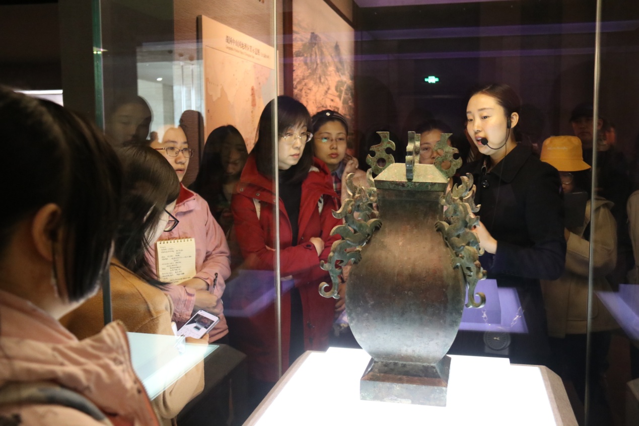 讲解员贾老师在讲解中山王刻铭铜方壶
