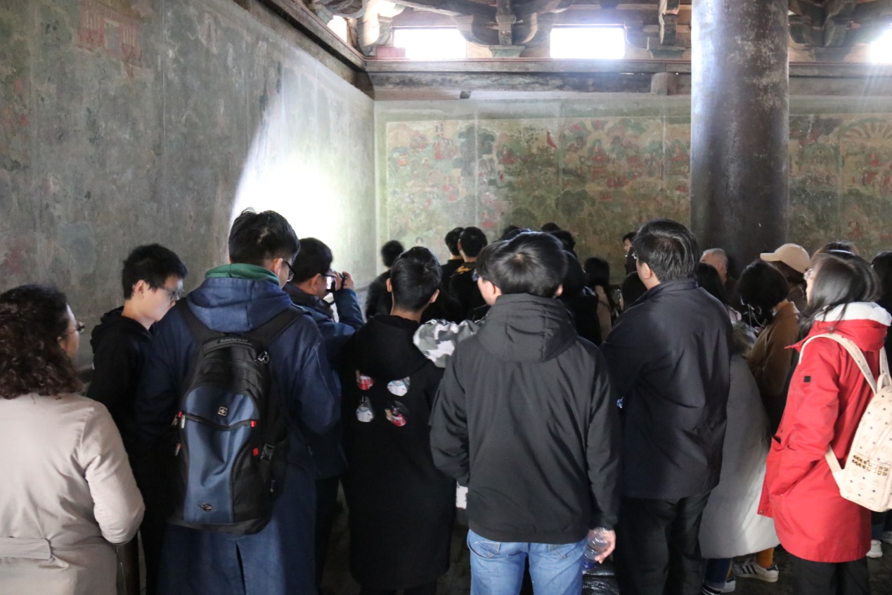 陈粟裕老师和张永波老师在为同学们讲解殿内壁画
