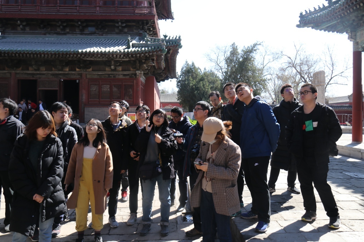 大悲阁内矗立着国内保存最好、最为高大的铜铸观音菩萨像,周身42臂,各臂分持日月、净瓶、宝塔、金刚、宝剑等,又称“千手千眼观音”。张永波老师遗憾的说,原两侧40双铜手臂均被毁,改为木制,仅前胸两臂为原铸。有同学发问“如此之巨大的佛像,该如何铸造呢?”陈粟裕老师给与解答 分步铸造,由下而上,最后添铸四十二臂,菩萨的手均为木雕而成,其上裹布,一重漆,一重布,然后用金箔贴成。张永波老师又补充道,佛像的胸腔内还藏有佛塔、经书等 ,同学们不禁为古人的工艺和智慧赞叹不已。随后,同学们又按序参观集庆阁遗址和弥陀殿等。陈老师则为同学们 讲解了何谓千手千眼观音,及须弥座的佛教含义和艺术价值。