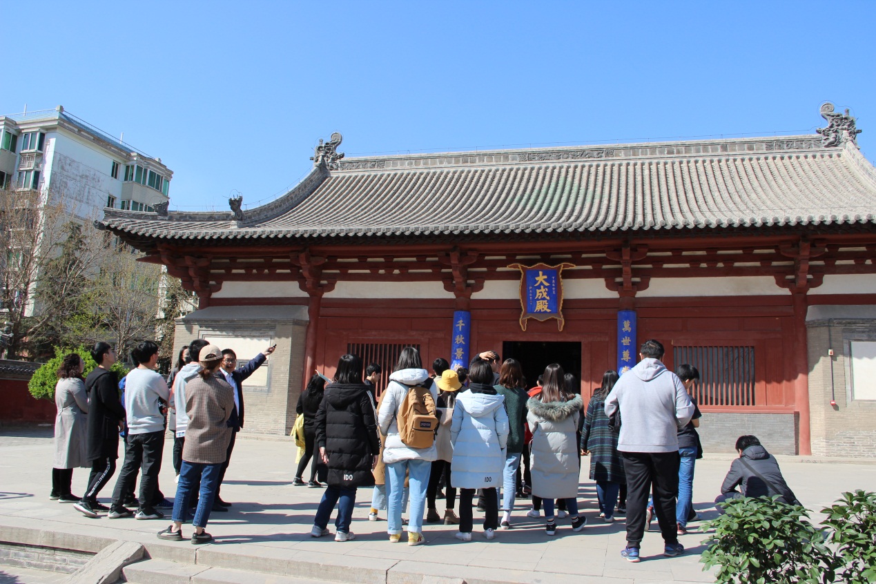 随后,师生一行步行赶往正定考察的第五站 正定文庙。张永波老师讲解到,该文庙的过人之处在于其保存着我国现存最早的文庙大成殿,1933年,梁思成先生认定其为五代时期遗存。文殿内的梁架、斗拱等,为研究早期建筑木构件的形制提供珍贵的实物资料。