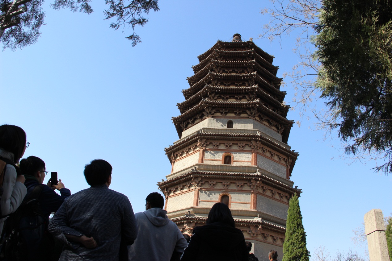 接着,师生又步行前往天宁寺。天宁寺始建于唐代,原是正定八大寺之一,历代变迁,寺内仅存凌霄宝塔。张永波老师解说到,该塔最大特点,在于塔身第四层中心部位竖立一根直达塔顶的木质通天柱,并依层位用放射状八根扒梁与外搪相连,这样的结构国内现存仅此一例,极其可贵。佛教专家陈粟裕老师就佛塔级舍利的基本常识为大家补充介绍。
