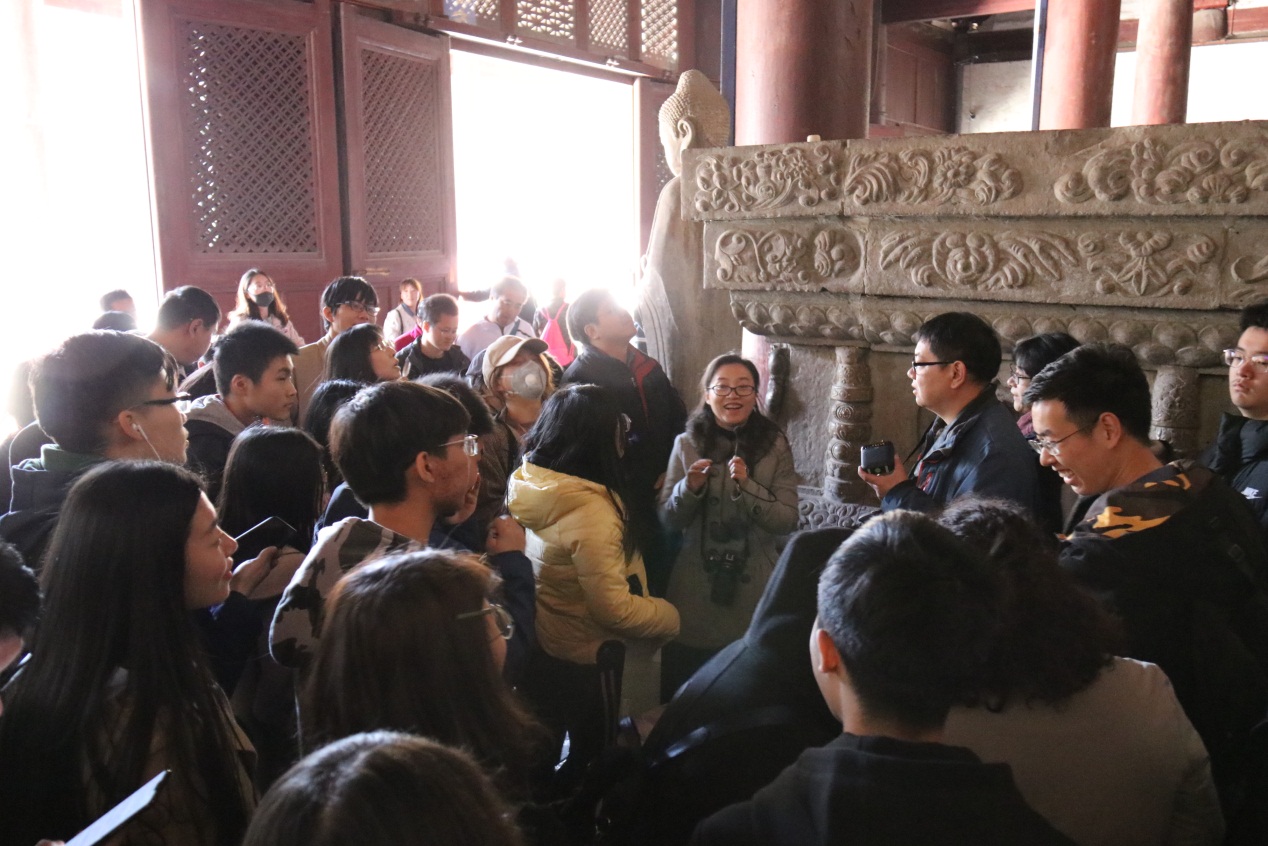 陈老师在为同学们讲解大悲阁内的观音像和须弥座