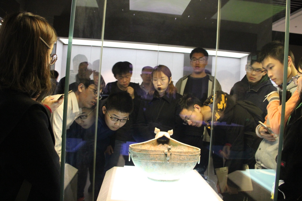 30日上午九点,师生们首先来到本次考察的首站 河北博物院。河北博物院是国家一级博物馆,藏品丰富,布展科学合理,具有很高的教学及科研价值。在“石器时代的河北”、“河北商代文明”、“燕赵故事”、“战国雄风”等展厅,讲解员结合河北地区石器时代、商周时期考古发现的石器、陶器、青铜器等文物和展板,介绍了河北先民的智慧以及丰富的社会风貌。出土于台西酿酒作坊遗址的人工酒曲最为吸引同学们的关注。讲解员讲到,虽然由于年代久远,酵母早已死亡,容器内仅存部分残壳,但其确实为目前现存最早的酒曲实物。燕下都出土的透雕龙凤纹铜铺首、成组铁范、金银饰品等,充分展示着燕国的磅礴气势,《赵国故事》则运用多媒体展示手段,演示“胡服骑射”、“完璧归赵”等故事,引得同学驻足观看。