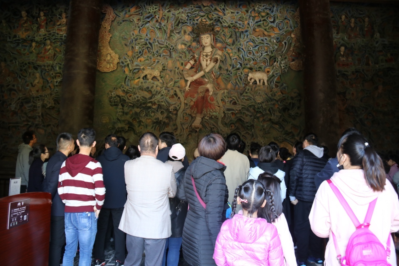摩尼殿内槽北壁为一座宋代的泥塑五彩悬山,又称须弥山。师生一眼便被端坐于中间的五彩自在观音像所吸引,佛像左足踏莲,右腿踞起,两手抱膝,身体稍向前倾斜,面容秀丽恬静,姿态优雅端庄。柳眉之下,智慧深邃的眼睛微微俯视,恰与礼佛者仰视时形成感情上的交流。张永波老师说其乃“中国最美倒座观音”。陈粟裕老师结合须弥山上的观音、大象等简要讲解了观音信仰的源流。