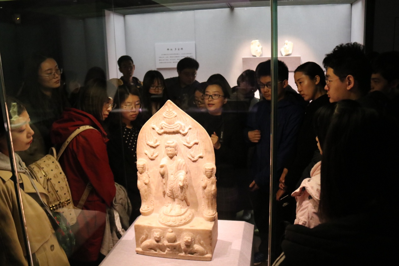 最后两个展厅,“曲阳石雕”与“北朝壁画”,由陈粟裕老师为同学们讲解介绍。曲阳是中国著名的石雕艺术之乡,白石雕刻尤为著名。在展厅中,陈老师重点对造像所反映的佛教信仰与不同时期造像特点进行介绍。比如北魏时期出现独立的观音菩萨造像,体现出这一时期《妙法莲华经•观音普门品》影响下观音信仰的独立。陈老师告诉同学们如何辨别观音像:“通常观音菩萨在头冠上会有一尊坐佛,而大势至菩萨头冠上则为宝瓶。我们所见的曲阳石雕造像由于多为民间造像,形象会有所不同,主要依据其题记进行判断。”与北魏时期瘦骨清像、褒衣博带的形象不同,北齐时期的造像雕刻非常华丽,其形象受笈多造像影响,衣物轻薄贴体,有“吴带当风,曹衣出水”之称。有同学对佛像衣着装饰名称提问,陈老师一一解答。