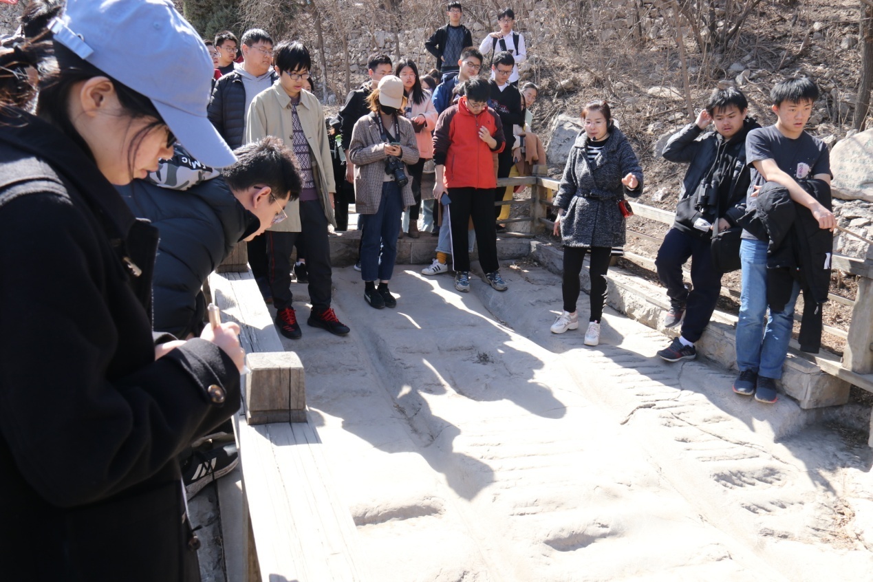 随后师生一行顾不上吃饭,直接乘车前往下一站 井陉古驿道。古驿道旅游管理处陈美杰主任为同学们导览讲解。时至中午,春光旖旎,日色丰盈,古道巍巍。顺着蜿蜒古道一路上行,坡度渐增,接近45度,崎岖艰难。再往上行,可见一座白色盘龙石雕护栏的石桥,通往三间石砌房屋,正中门楣上凹嵌长方石刻着“立鄙守路”四字。陈主任告诉大家,这一建筑为清嘉庆年间供官员休息、补充给养、传送官文函件的场所,迄今已有200多年历史,与秦皇古道相比非常年轻,但它却是中国现存最早的一座古驿站,被称作邮驿史上的“活化石”。结合石屋里的古驿道示意图,陈主任为大家介绍井陉古道概况。秦皇一统中国后,以咸阳为中心修筑驿道,井陉古驿道就是当时主干线上重要一段,也是我国仅存的古道陆路交通道路的实物。原驿道全长约百里,贯穿太行,后来修建307国道时,基本沿着古驿道行进修建,现存的驿道为国道修建时绕行幸存下来的一段古驿道。井陉为太行八陉之一,此地关山环立,地势险要,是山西、陕西通京的交通要冲,为历代兵家必争之地,王翦伐赵之战、韩信背水之战、郭子仪平定安史之乱、庚子长墙阻击战等都发生在这里。在“秦始皇歇灵台”处,保存着一处车辙痕迹明显的古驿道。陈主任给结合这处遗存,给同学们讲解了古驿道的建造、维修办法,解释了路旁石孔等作用,及为何古道上会留下如此明显的车辙痕迹。