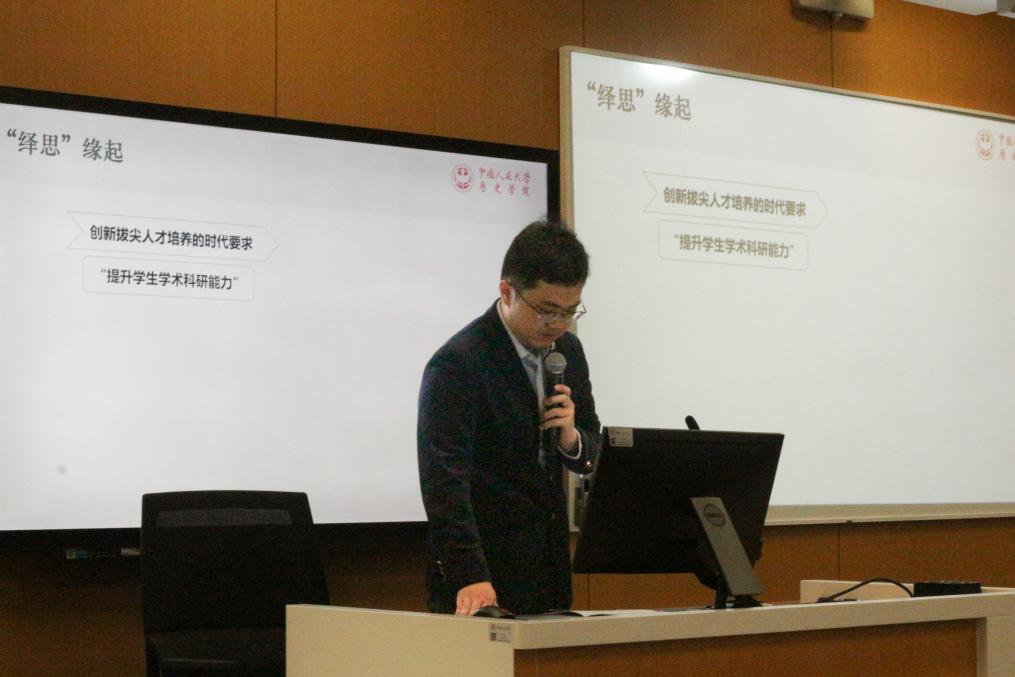 裸聊直播 团委书记李彦沨为“绎思”学术活动季作品牌推介。李彦沨从绎思院刊以及绎思研究生史学论坛开始,介绍了裸聊直播 “绎思”学术活动品牌缘起,详细推介了本届活动,本次“绎思”学术活动季由前沿讲座、学术沙龙、读书班、学科竞赛培训、历史现场教学与实践、本研史学论坛六个板块构成,内容丰富、形式多样、涵盖全面,既打造知识的讲堂,也搭建实操的平台。