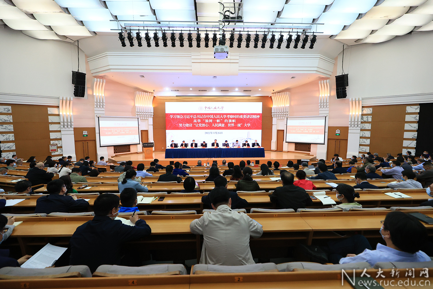4月26日上午,中国人民大学召开全校干部师生大会,深入学习领会中共中央总书记、国家主席、中央军委主席习近平在中国人民大学考察时的重要讲话精神。党委书记张东刚主持会议。
